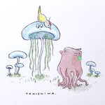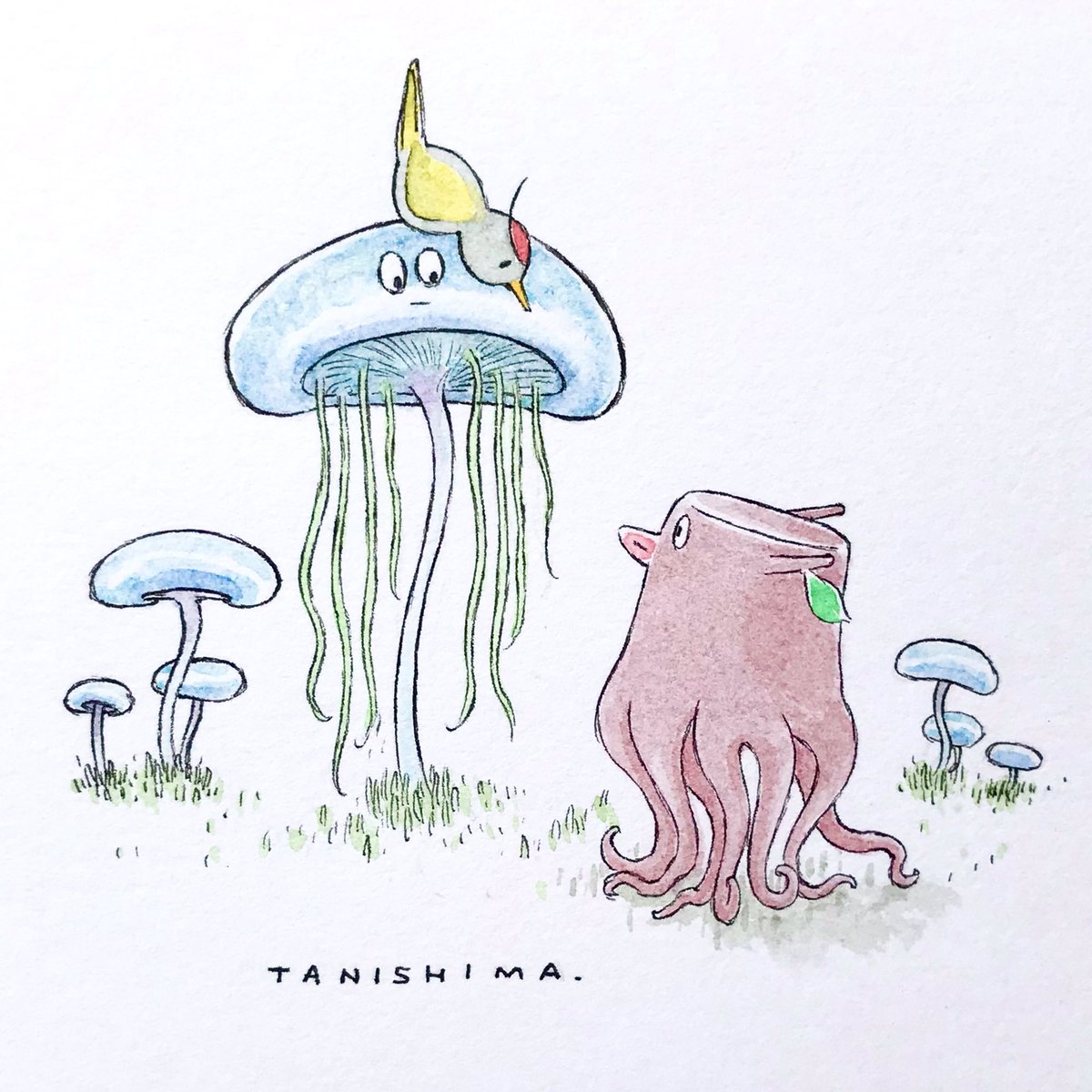 カブタコを海に誘うキツツキ坊や。 海を知らないカブタコ。 #カブタコ #切株 #kabutako #treestump #woodpecker #谷縞 #イラスト #アート #絵本 #水彩 #tanishima #drawing #illustration #art #sketchbook #picturebook #watercolor