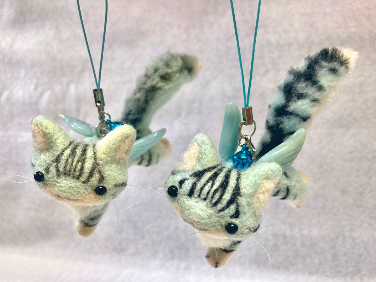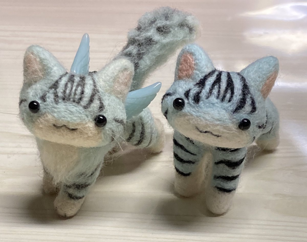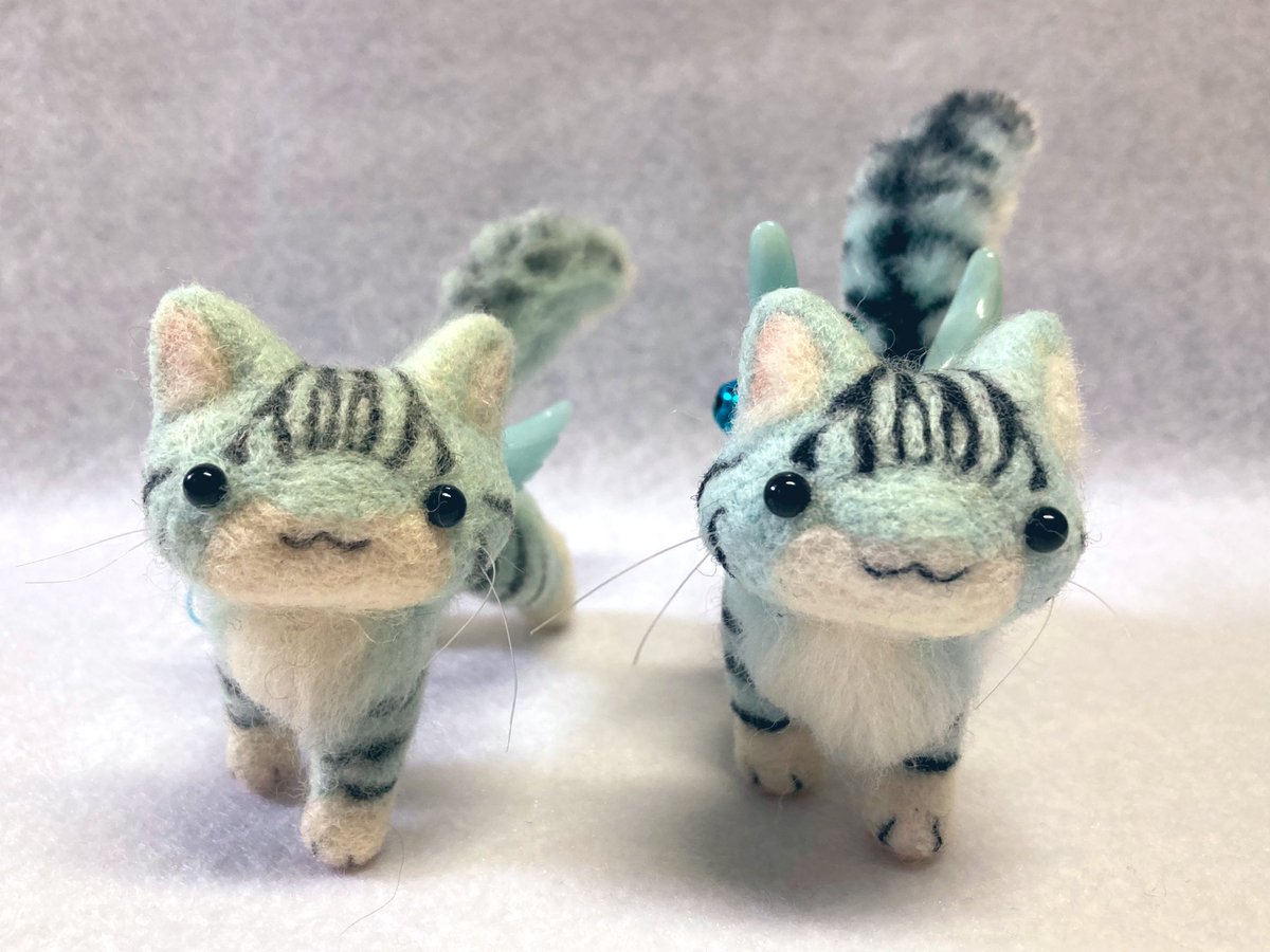 0 7 アマゾナイト翼猫2号🐈完成しました!ヽ(*⌒∇⌒*)ノ::・゚☆。 前の子より少し大きく、尻尾も更にモフくなりました😅 出来るだけ頑張ってはみたものの、やっぱり完コピは無理でした🙇♀️💦 #羊毛フェルト 22/03/29 12:50