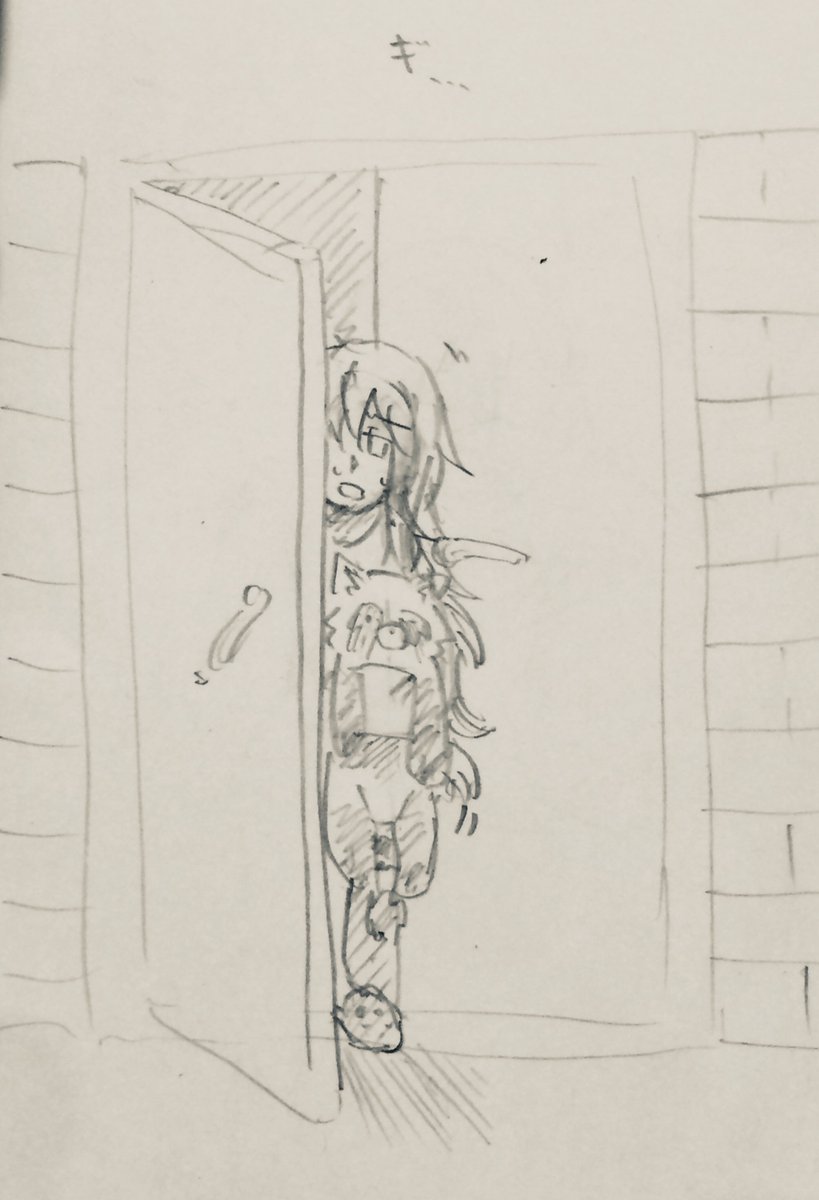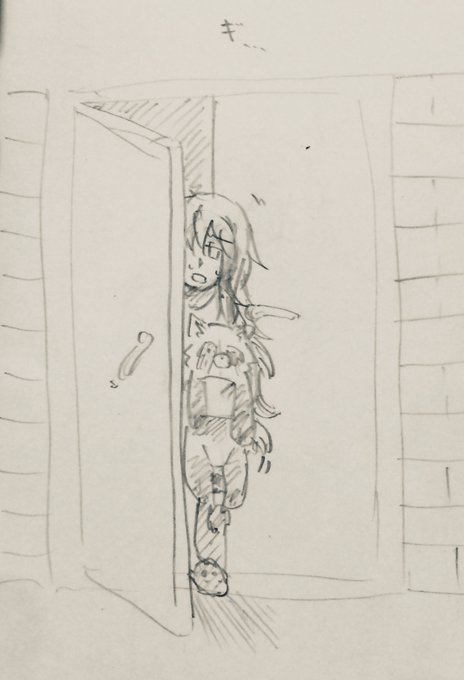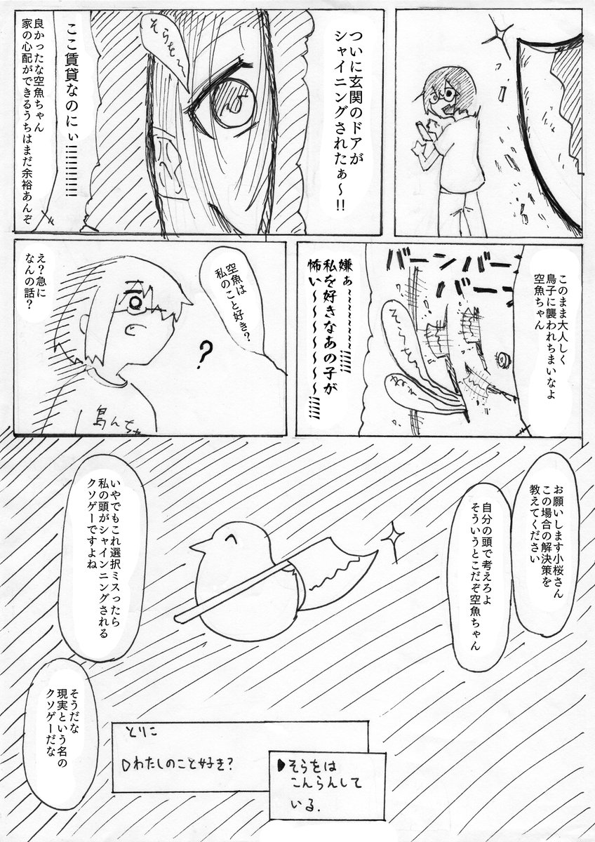 紙越空魚の後輩を名乗る怪しい女が訪ねて来た際に、裏世界の刺客とマジもんのヘルプの2つの可能性を天秤に掛けつつ、お守りを手に門扉を開いた小桜さん落書き
