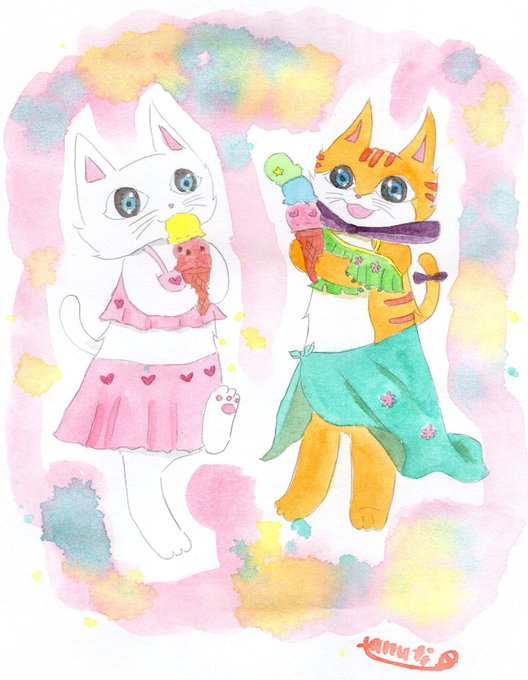 3 31 にゃんことアイスクリーム🍨💖💖 #イラスト #お絵描き #アート #絵 #水彩画 #アナログイラスト #透明水彩 #猫 23/04/05 20:39