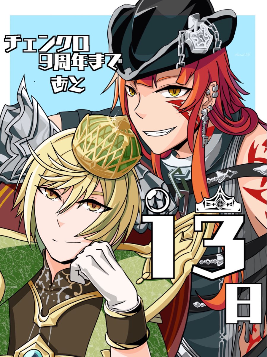 チェンクロ9周年まであと13日✨ 本日13日を私と愛すべき問題児2人と一緒に繋いでいきます! 素敵な企画をしてくださったいぬきちさんに感謝を!!! 盛りあげていっくぞー!!! #チェンクロアート #チェンクロ9周年カウントダウン/リレー企画