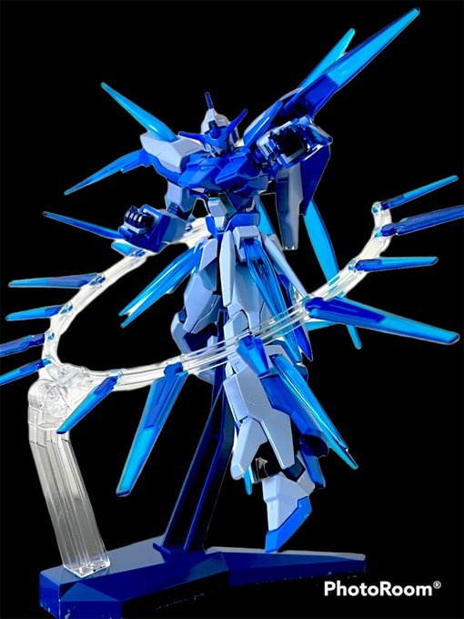 HG 1/144 ガンダムAGE-FXバースト完成 エネルギー噴射のエフェクトパーツを全身に装着することで、非常にトゲトゲしくなりますが、青色クリアパーツが綺麗です。 また、ファンネルが装着可能な専用台座も付属するため、ポージングが簡単に決まる、大満足の機体でした^_^ #ガンプラ #AGEFXバースト