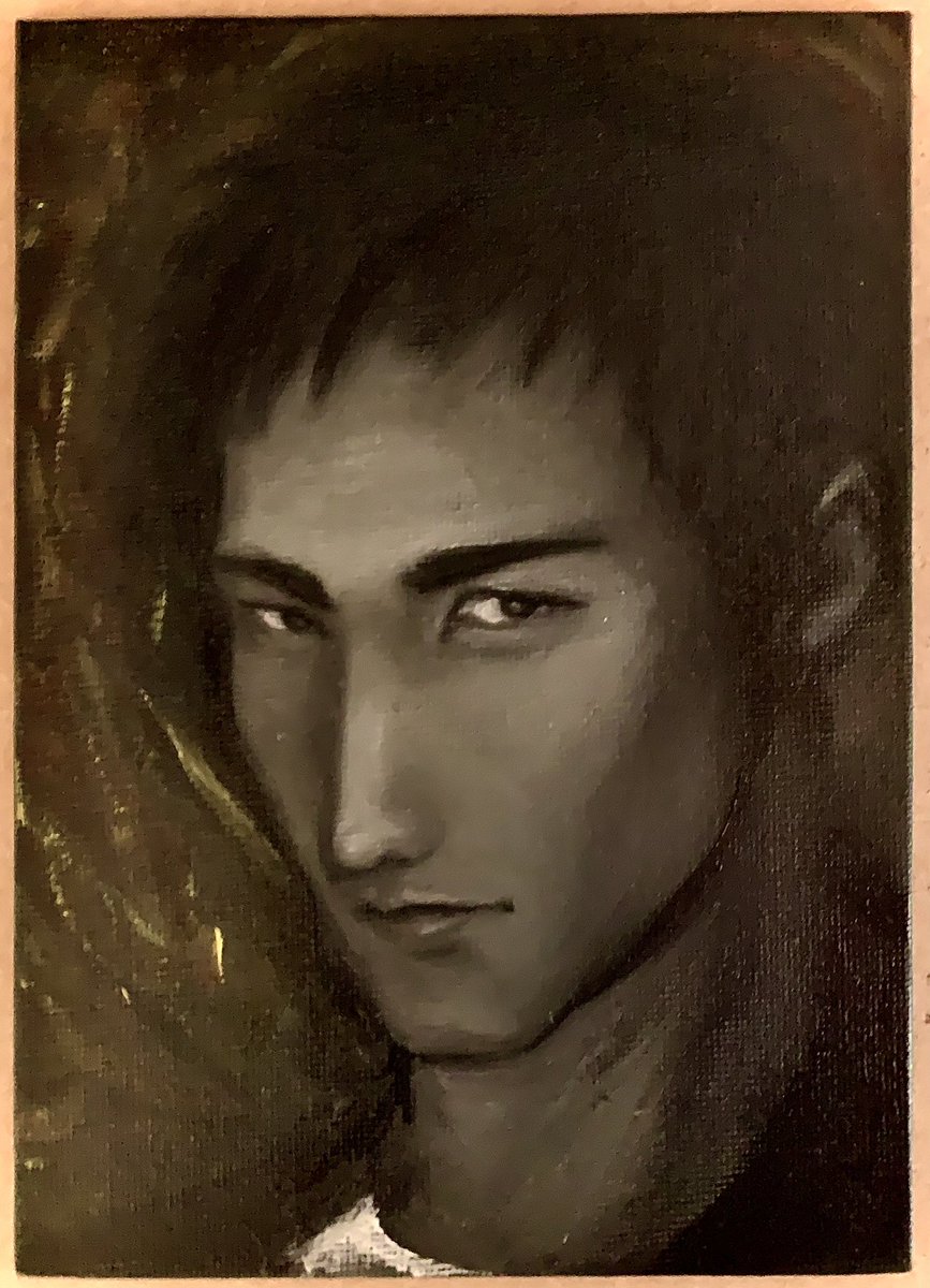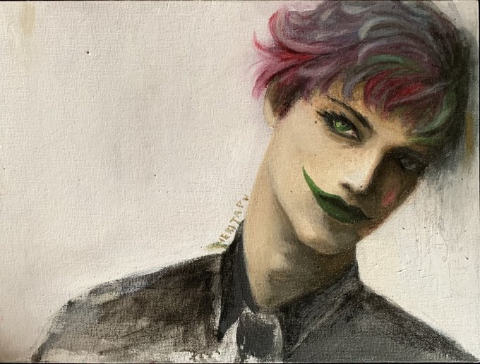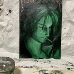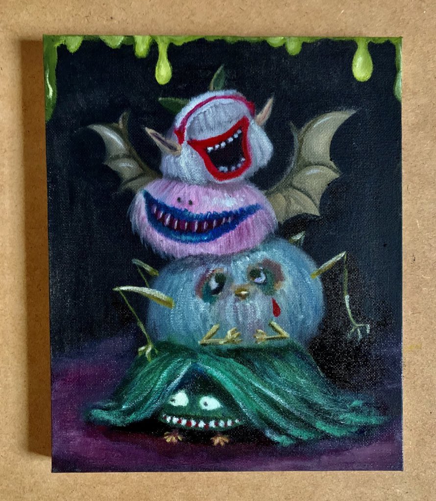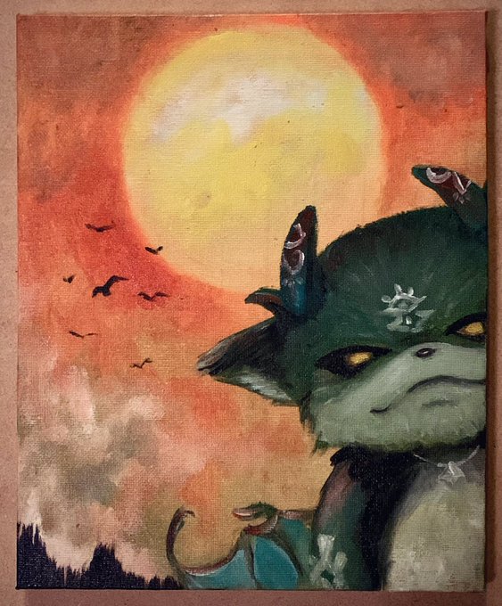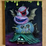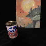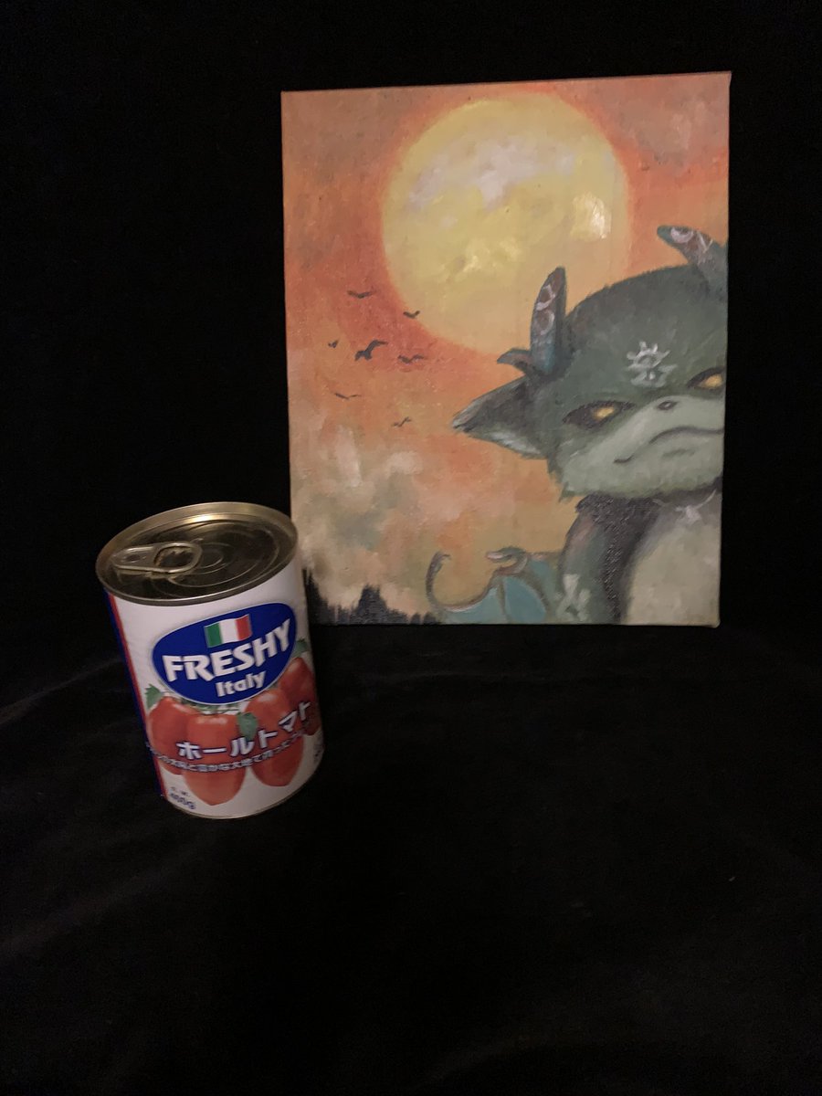 初めて油絵の具で 恐ろしい 恐ろしい でびでびでびる様を描きました!なんて恐ろしくてフォトジェニックなんでしょう… 大きさの比較対象として、トマト缶を置きました #でびるさまにささげるえ