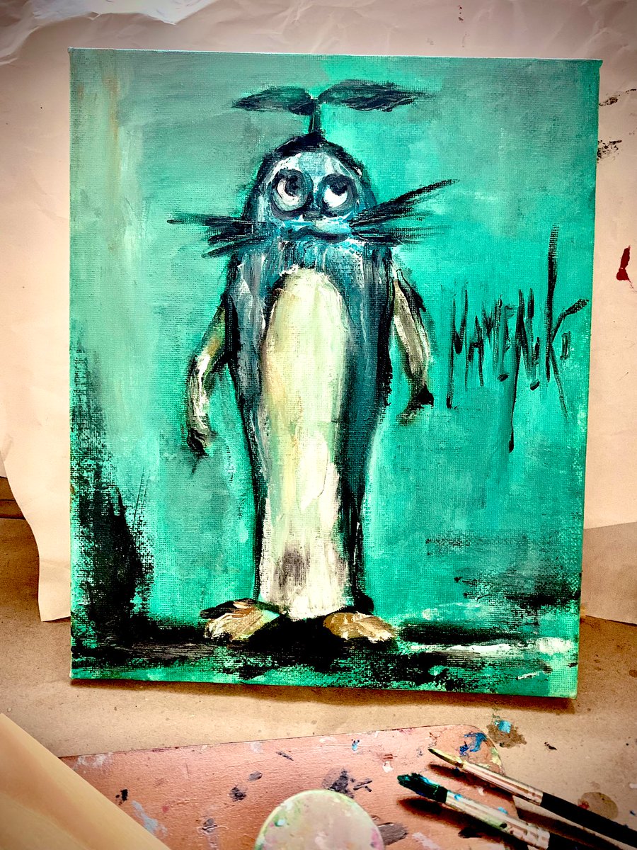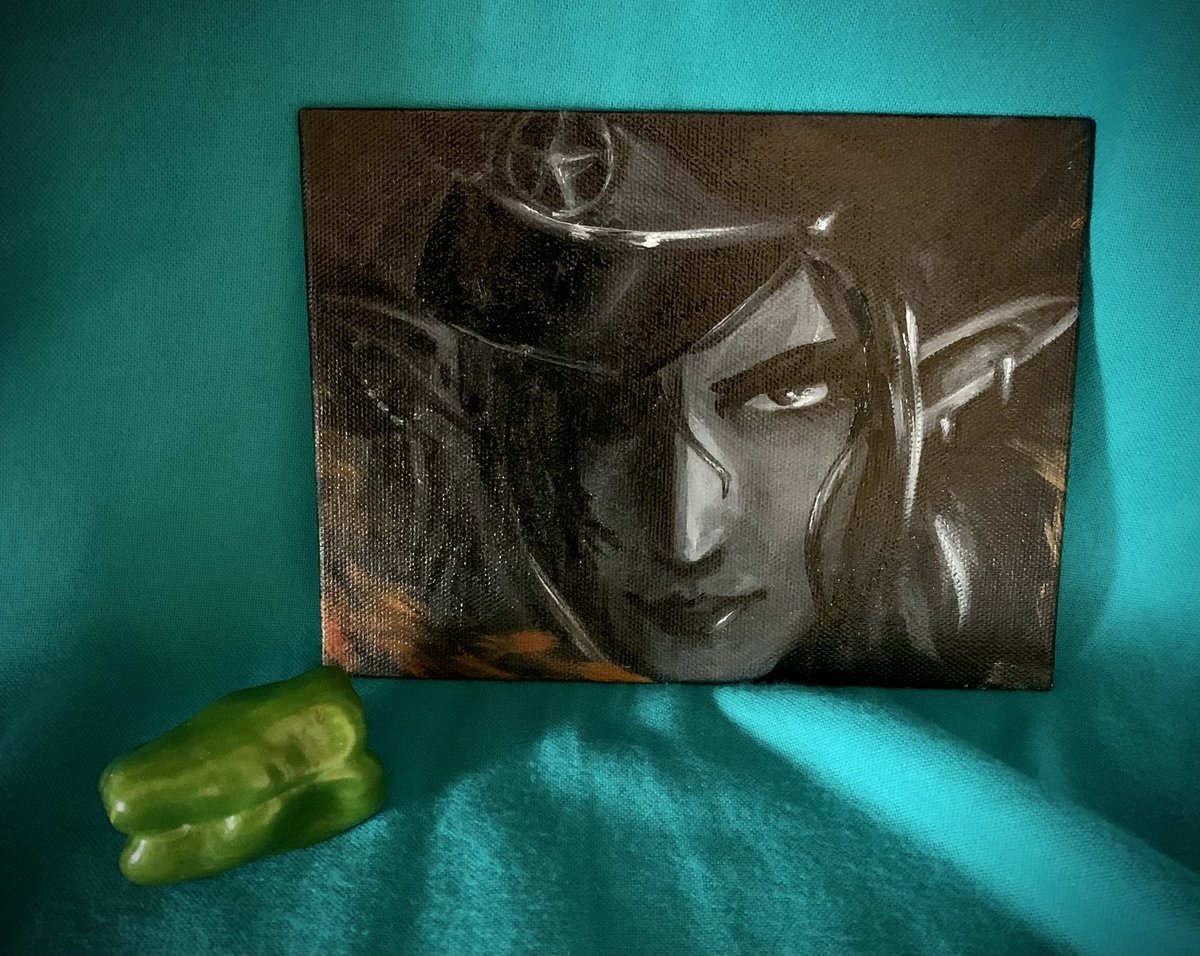初めてチャイちゃん描いた! 油絵具で描いたから、画面が光って全然上手に写真が取れなかったよ!でもチャイちゃん描くのめっちゃ楽しい! 大きさの比較対象として家にあったピーマンを置きました。 #お花畑青空大写生大会