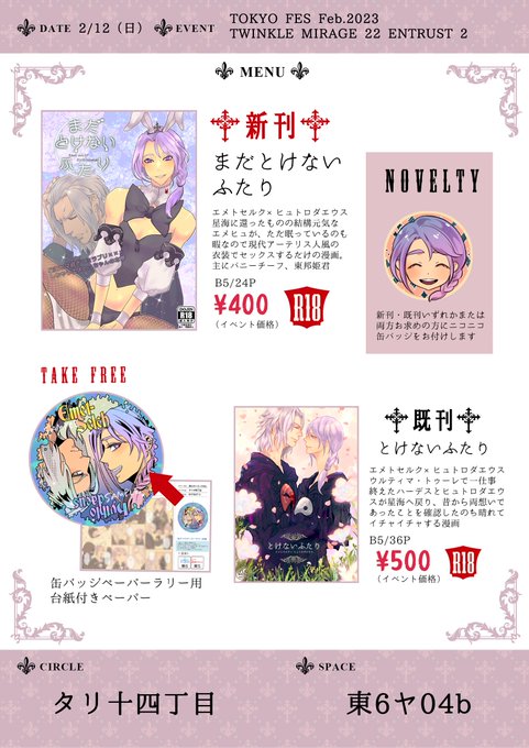 無配ペーパーも入稿終わりましたのでお品書き確定版作りました!誰か…誰か来てくれ!!! 新刊サンプル twitter.com/tariyoshida/st… 通販(とら) ec.toranoana.jp/joshi_r/ec/cot…