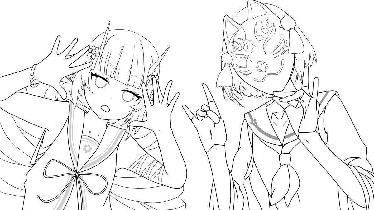 😈×🦊 塗り絵用線画です。色んな方の塗り方を見てみたいのです!使ってくださると嬉しいです😊 (リプに色塗り参考あげてます。レイヤーを使い分ける際は線画抽出を行ってください。) #コンパスお絵かき
