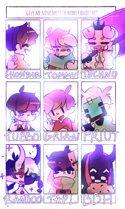 I decided to do 9 since I was too indecisive DON'T FORGET TO UNTAG! #ghostburfanart #wilbursootfanart #tommyinnitfanart #technofanart #technobladefanart #tubbofanart #grianfanart #fruitberriesfanart #ranboofanart #taplfanart #bbhfanart @Technothepig @froubery