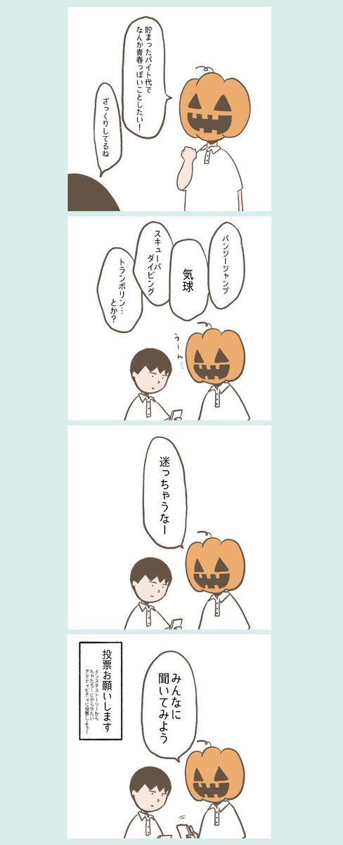 第61話 青春したい 飛ぶカボチャ、浮かぶかぼちゃ、潜るかぼちゃ、跳ぶカボチャ。あなたはどのかぼちゃを選ぶ?(投票はすでに終了しています) #漫画 #イラスト #イラスト好きな人と繋がりたい #青春 #高校生 #絵描きさんと繋がりたい