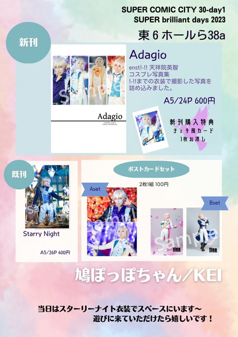 26 22 【拡散いただけたら嬉しいです!✨】 5/3 スパコミ・ブリデお品書きです! 鳩ぽっぽちゃん 東6ら38a ソロ遠征民なので当日はたくさんの方とお会いできたら嬉しいです。ぜひ遊びに来てください♪ よろしくお願いします! 新刊収録衣装はツリーに😊 23/04/30 21:37