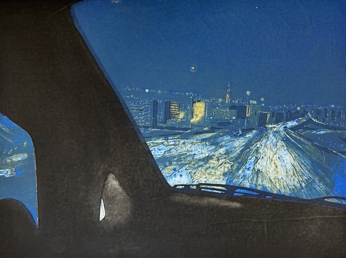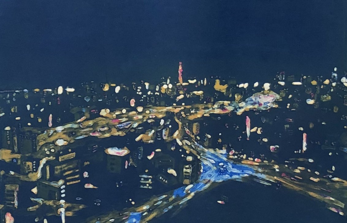 2 20 版画のコラグラフ技法を使い制作しました。 観覧車の中から見た大阪万博公園付近を描きました。 誰と見たか、その時の感情で夜景は人によって思い巡らすものが変わるのでは?を考え制作しました。 #タツセレ2022 出品中です。 通販受付、作品画像▶︎ t2y.info/artist01/13709… 22/02/22 12:46