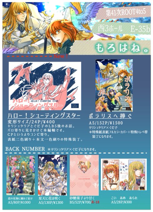 【12/18るーしこお品書き】 12/18開催『第41次ROOT4to5』お品書きです。 配置は西3ホール【E-35b】、サークル名は『もろはね。』です。 新刊既刊含め全てキリぐだ♀になりますので、宜しくお願いします🤗 支部詳細→pixiv.net/artworks/10349… 委託通販(🐯)→ecs.toranoana.jp/joshi/ec/cot/c…