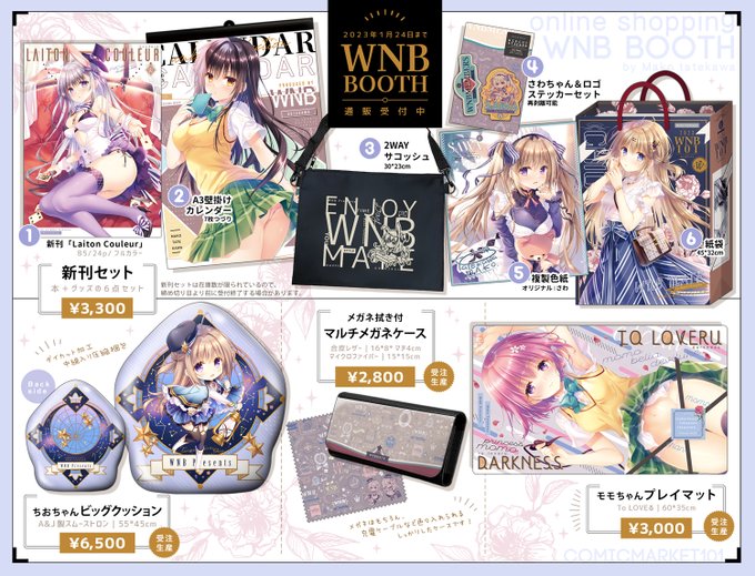 コミケ101新作の通販受付を開始しました。新刊とカレンダーとサコッシュなどが入った新刊セット、でっかいクッションと色々入れられるメガネケースとモモちゃんプレイマットです! 1月24日(火)23時までの受付です、よろしくお願いします🙏✨✨ wnb.booth.pm