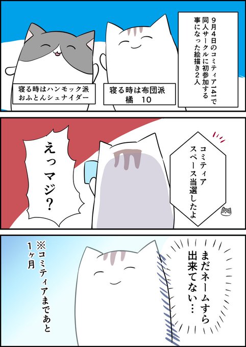コミティアで初サークル参加してきたよ!レポ 友人のおふとんさん(シュナイダ–@ohtn_S)と合同サークル参加してきた話です。※マスクは省略して描いております。何卒。 #コミティアレポ #エッセイ #漫画が読めるハッシュタグ (1/3)