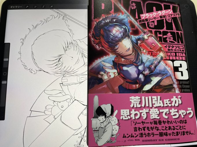 「ゴアゴア娘」3集、明日8月19日発売になります。 帯は荒川弘さんに頂きました! 🙇♂️ 明日は広江さんの本家「BLACK LAGOON」12集とイラスト集も発売です。 共々よろしくお願いします!
