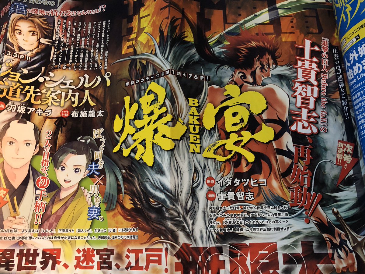 38 61 本日発売の少年シリウスで予告が載りました。 新連載です。 原作:イダタツヒコ 漫画:士貴智志 『爆宴-BAKUEN -』 月刊少年シリウス 4月号にて、カラー込み76ページのボリュームで開宴となります。 20/01/25 11:02