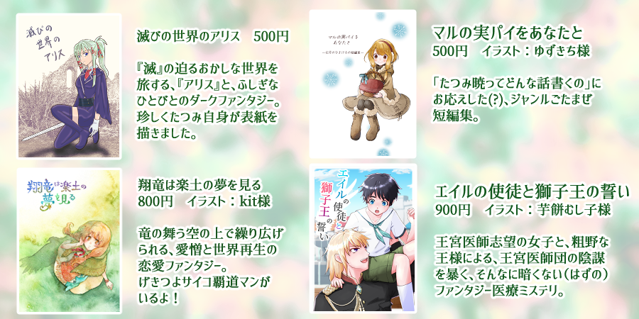 5/5に東京ビッグサイトで開催される #COMITIA144 に、そ17b『七月のなまけもの』で参加予定です。 新刊はおかしなダークファンタジー掌編連作『滅びの世界のアリス』。例によって、書き下ろし掌編を収録した無料配布本もあります。