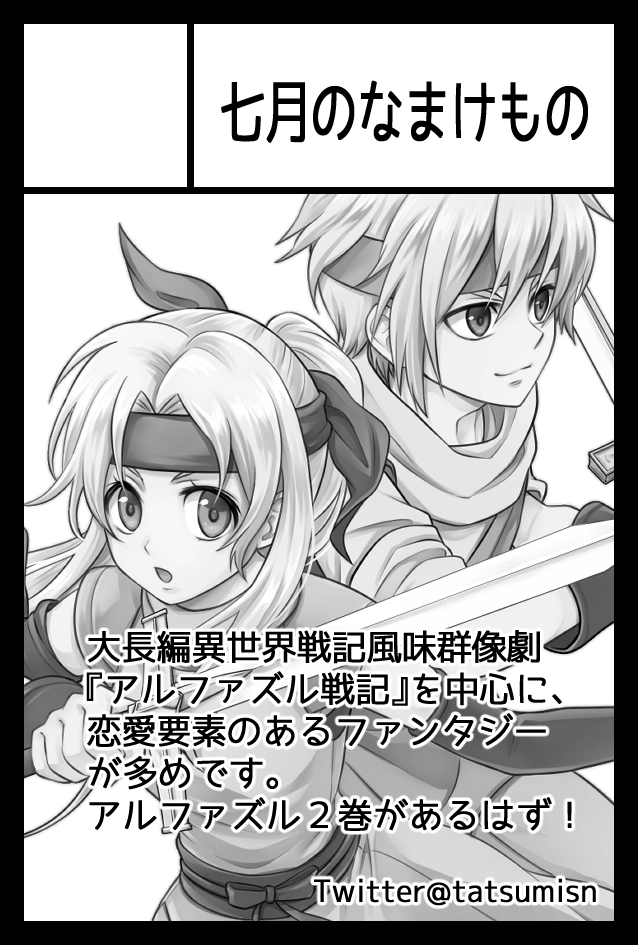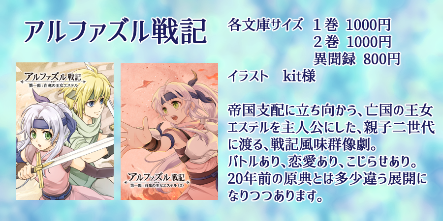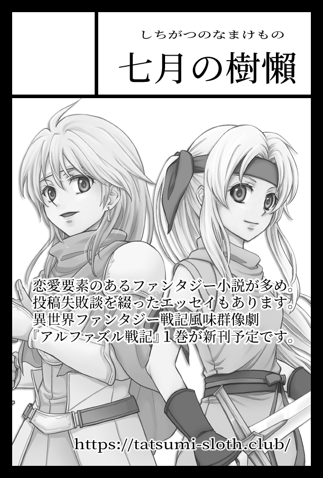2/19に東京ビッグサイトで開催の #COMITIA143 に参加します。か38b『七月のなまけもの』です。 ファンタジー小説中心、2巻まで発行の大長編群像劇と、単巻完結2種、短編集を持っていきます。無料配布本は書き下ろしを誤字りましたので、そのうっかり加減を笑っていただければ幸いです。