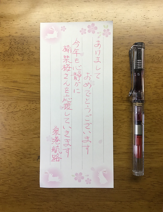 6 69 あけましておめでとうございます セーラー万年筆の別のインク「桜森」を使ってみました 万年筆はラミーのサファリ(スケルトン) 今年も静かに楠栞桜さんを応援して復帰を待ちます #さくらのしおり #楠栞桜 22/01/01 11:33