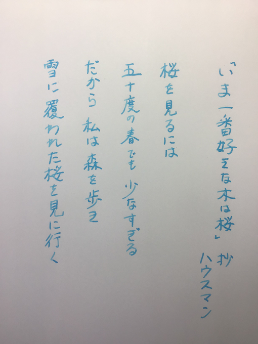 セーラーのインク「雪明」を使用 特殊ペン先(ズーム)を使いこなせず上手くない字がさらに乱れていますがインクの陰影に注目 英国詩人ハウスマン(1859-1936)による「一番好きな木」の一部を自分で訳してみました 厳しい冬に静かに楠栞桜さんを応援して復帰を待ちます #楠栞桜 #さくらのしおり