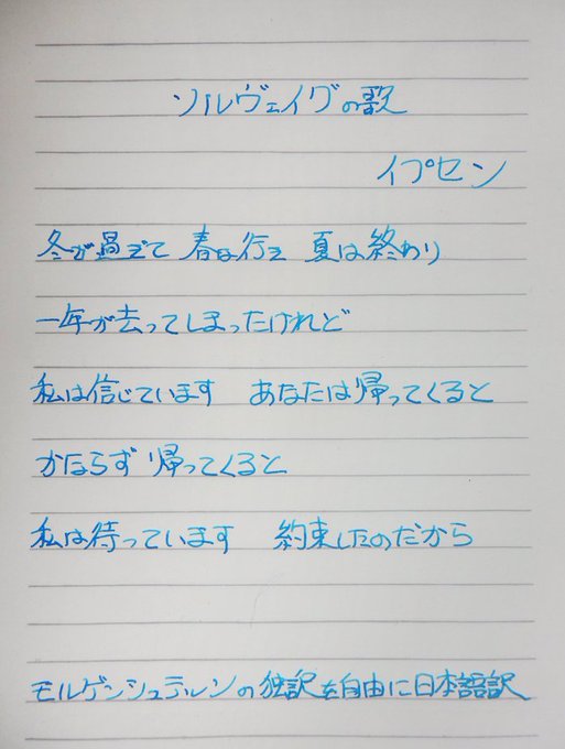 万年筆はペリカンM800 インクは同社エーデルシュタインのトパーズ イプセン「ソルヴェイグの歌」 グリーグの名曲で有名 モルゲンシュテルンの独語訳を 桑港航路が自由に日本語訳 驚くほど感傷的で甘い詩 中年男が言える台詞ではないが 人の言葉を借りればなんとかなる魔術 #さくらのしおり #楠栞桜