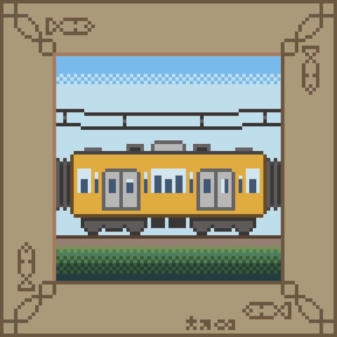 気まぐれしりとりドット絵 第2弾は『通勤電車』 スーツ→通勤電車→? 朝早くにベッドタウンから都心に向かう通勤電車 日が沈む頃に疲れた集団を乗せていく通勤電車 今日もゴトゴト働く人を乗せていく 次回はシャから始まるものを描きます! #気まぐれしりとりドット絵 #ドット絵