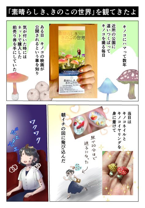18 55 フォロワーにキノコの映画を布教するために感想漫画を描きました😊✨貴重で美しい映像がたっぷり観られるのでオススメです‼️🍄 ※ネタバレ有り注意! #素晴らしききのこの世界 #きのこ映画みた 21/09/29 13:24