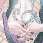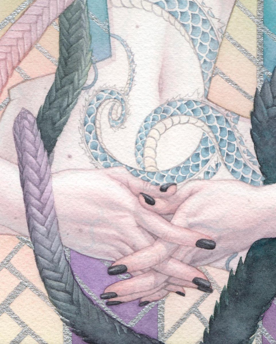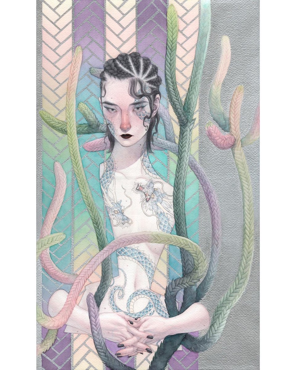 みうらじろうギャラリーで開催中のグループ展『端月譚2023』より。 「青鎖竜」 M8号 多肉植物のムスコーサ(青鎖竜)をモチーフに。胸元の竜がお気に入り✨ 作品はメールにて通販でもお取り扱い頂いておりますので、よろしければご覧頂けますと幸いです。 jiromiuragallery.com/exhibition/pas…