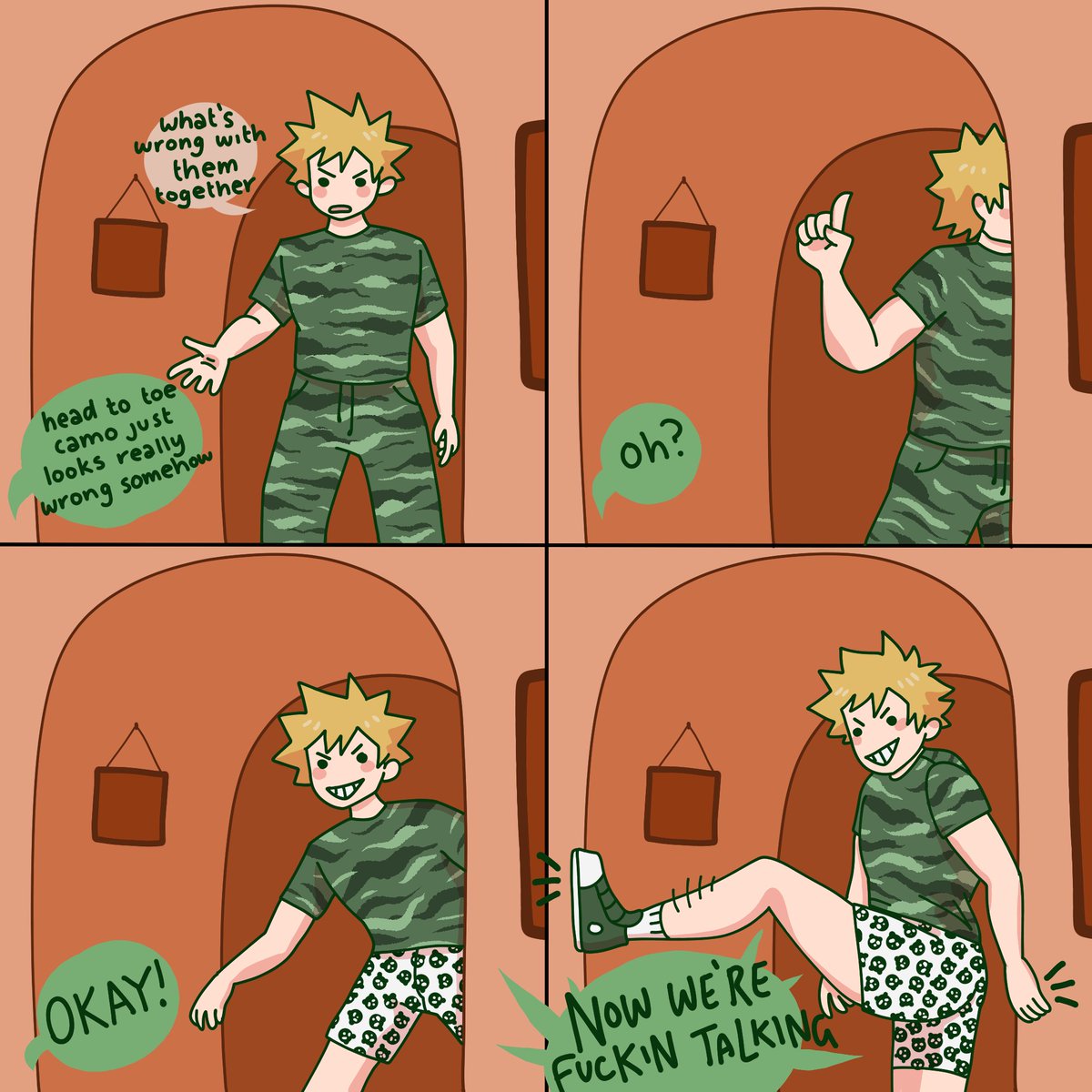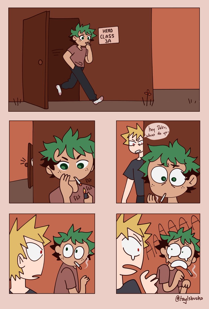 lotta people think baku would be the one who smokes illegally... but dekus the borderline vigilante whilst bakugo has top grades and sleeps at 8:30, he'd be so scandalized. unfortunately for deku, he eats bakugous validation for breakfast, lunch and as an afternoon snack