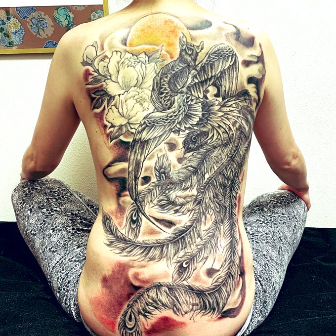 鳳凰 花の色入れは肌が落ちつく秋まで様子見 #tattoo #タトゥー #刺青 #日本画 #水彩画 #鳳凰 #フェニックス #phoenix