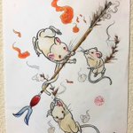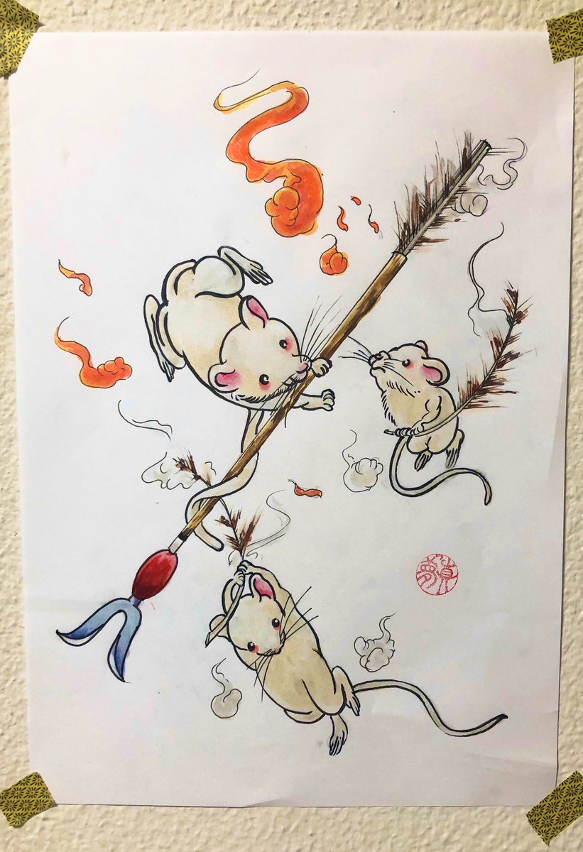 スサノオが野原に鏑矢を放ち半人前だった大国主に「矢をとって来い」と命じ必死に探しに行くとスサノオは野に火をつけ一瞬にして大国主は炎に包まれた。そこに子連れのネズミが現れ地下の巣に案内し矢の本体を母親が焦げた羽を子ネズミが探しだし大国主命に渡したと言われています #tattoo #コピック