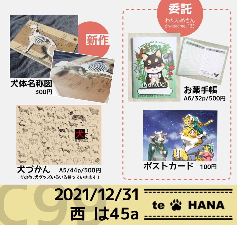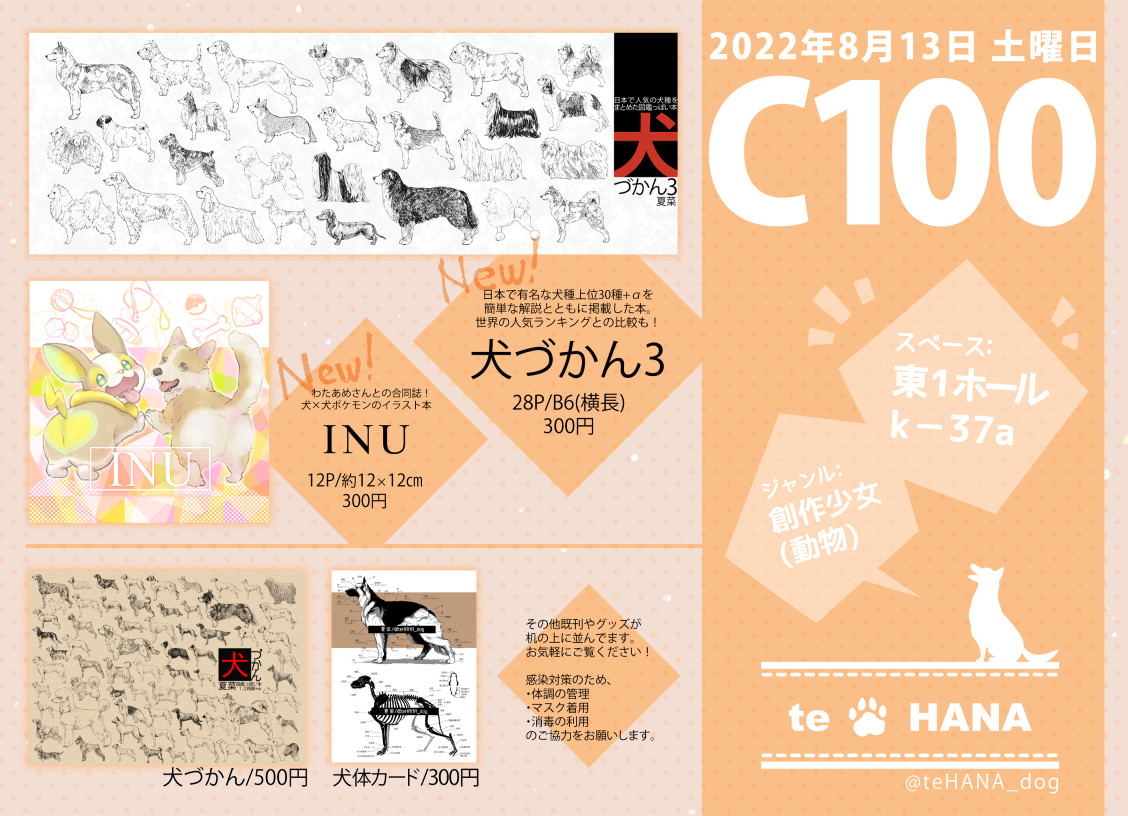 C100 コミックマーケットのお品書きです~~! 13日ビックサイト 東1 K-37aでお待ちしてます! よろしくお願いします😊😊🙏 新刊サンプル: 「INU」 twitter.com/teHANA_dog/sta… 「犬づかん」 twitter.com/teHANA_dog/sta…