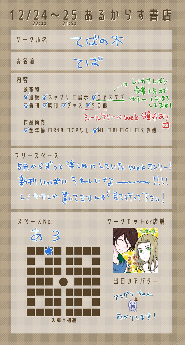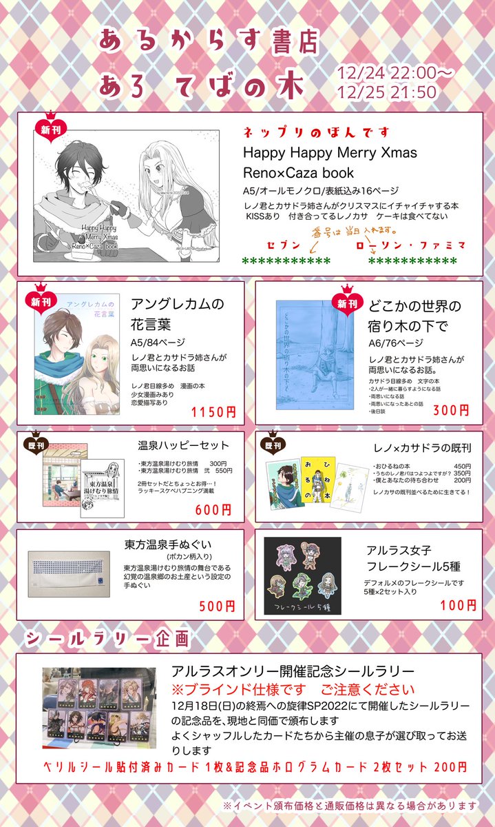 #あるからす書店 #あるからす書店_お品書き お品書き出来ました!! ネップリ本は当日までに仕上げます……よ! 新刊・シールラリーWEBオンリー頒布含め、24日 22時よりBOOTHをオープン予定です!! また開催中、ゆるくレノカサエアスケブも募集しますので書き込みボードへお願いします✨