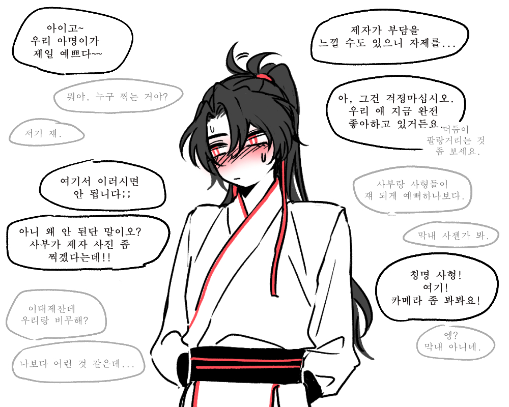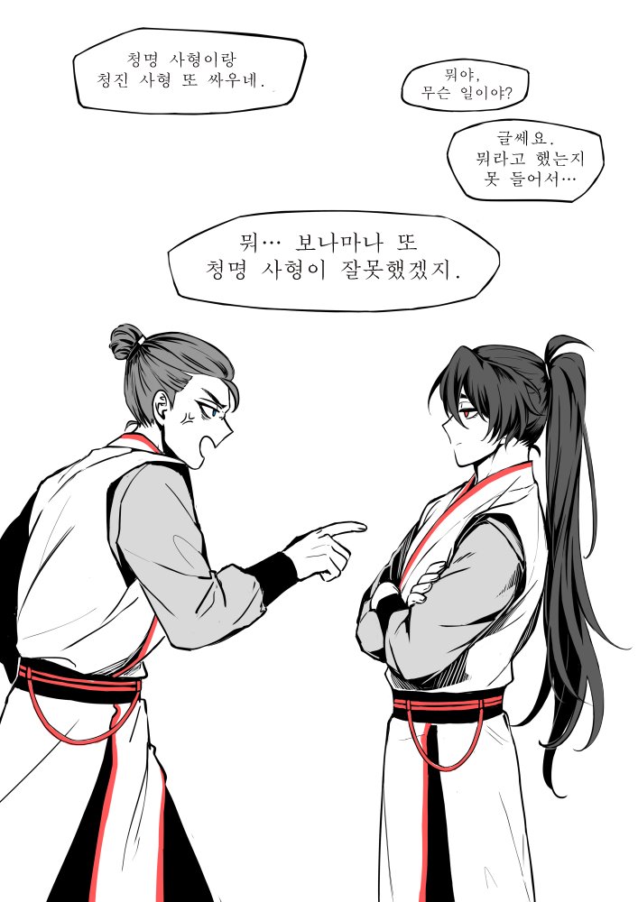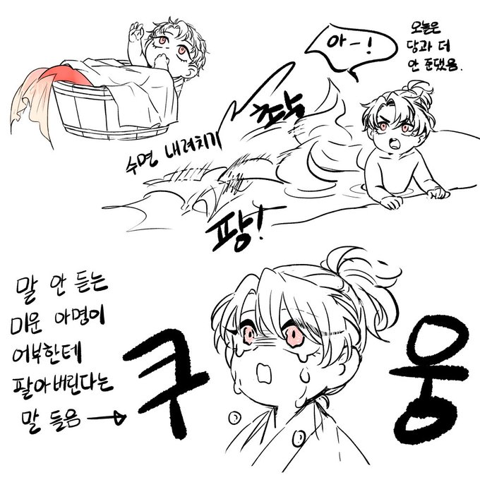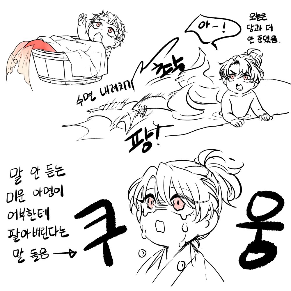 산문 앞에 버려져있을 때 어항...은 아니고 물동이나 목조 대야에 담겨()있었을 듯... 물 밖에선 말 못 해서(어릴때만 그랬어도 좋고 다 커서도 그러는 것도 좋고) 짜증나면 꼬리로 수면 존내 내려치는 버릇 있음 좋겠다ㅋㅋ 어릴 때 사숙이 어부한테 팔아버린다고 놀렸다가 대성통곡한 적 있는데