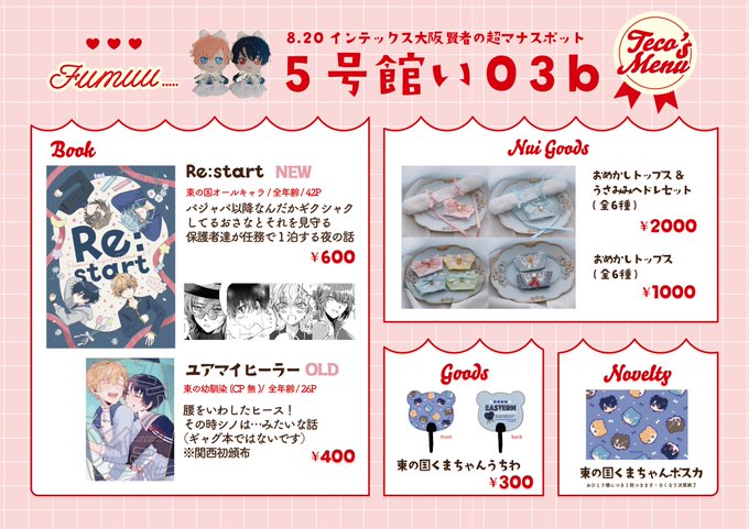 30 59 🌷8/20 インテ お品書き🌷 賢者の超マナスポット 5号館 / い03b / fumuu..... ナオ( @nu_nuinonui )と合同スペです! 私の方は東の国本、おさな本、ぬい服、うちわなどいろいろ頒布します〜! よろしくお願いします☺️🩵 23/08/19 15:36