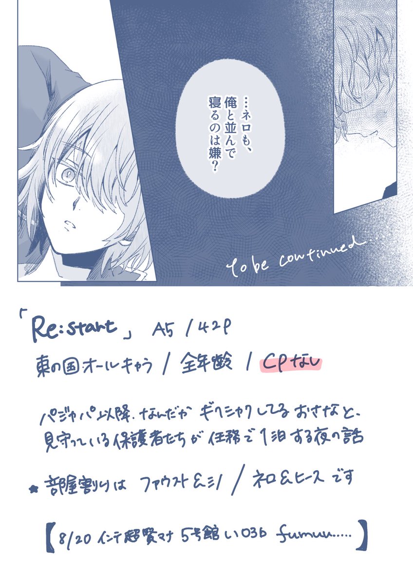 21 69 🌷夏インテ新刊🌷(1/2) 賢者の超マナスポット 5号館い03b fummu.....🧸 東の国オールキャラ/全年齢/42p パジャパの一件からどうも噛み合わないシノとヒースと、そんな2人を見守る保護者たちのとある一夜のお話です〜! 23/08/15 20:54