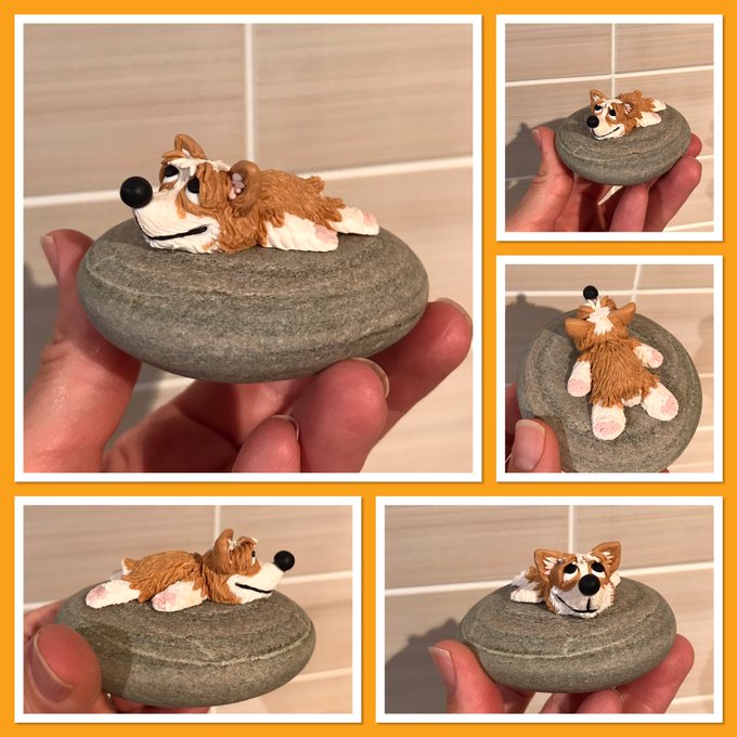 Freshly made mini pup on a pebble! 🐾 Had to photograph in electric light as he’s just out of the oven, I’ll update with better photos tomorrow but I think he’s kinda cute, hope you like him too #corgis #MHHSBD #Earlybiz #petportraits #handmade #polymerclay