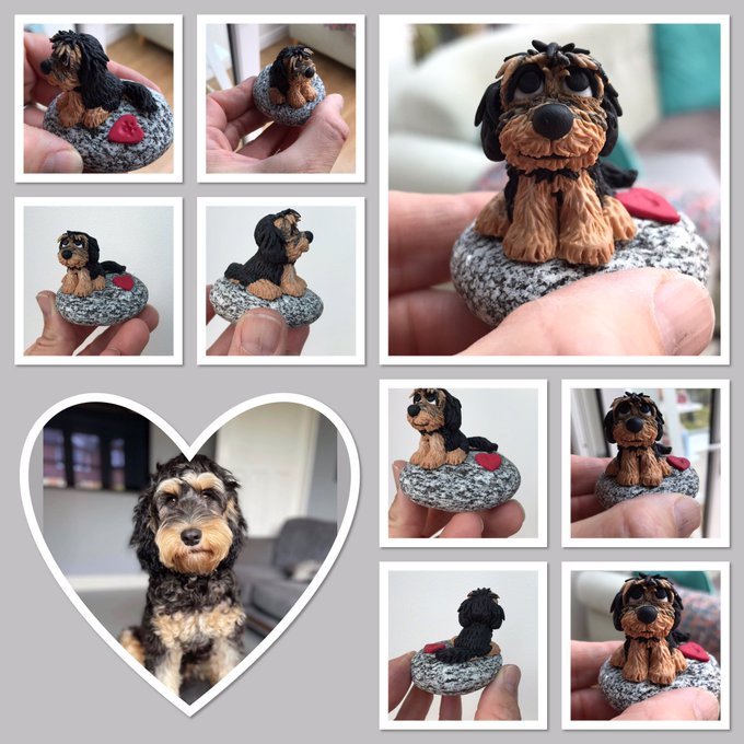 Meet gorgeous Gino the cockapoo 😍 his mum asked me to make him in miniature sitting on a pebble, what do you think of his tiny mini me? #MHHSBD #UKGiftAM #UKGiftHour #handmade #EtsySeller #petportraits #dogsoftwitter #polymerclay