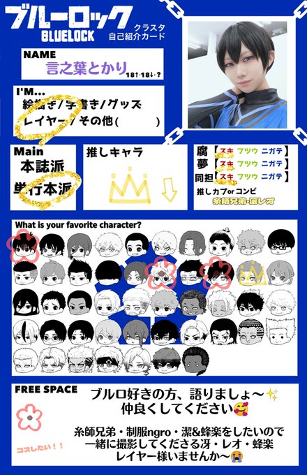 ブルロハマったので近々撮影の予定を立てたいのと、同士が欲しいのです!!!!! RT中心にお迎えに行かせていただきます! #ブルーロック好きな人と繋がりたい #コスプレイヤーさんと繋がりたい #カメラマンさんと繋がりたい #ブルロクラスタカード