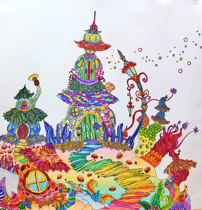 細すぎてカオス! 色使い過ぎた(´×ω×`) (ー̀_ー́;)キチャナイ… #塗り絵 #大人の塗り絵 #色鉛筆