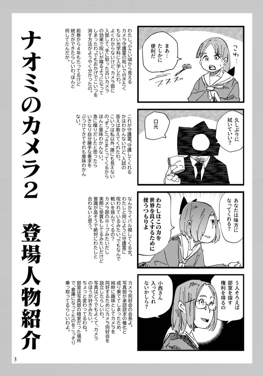 コミケ101の新刊は「ナオミのカメラ2」です。カメラ型の守護霊が戦う?漫画です。沼っぽくないお話なので肩の力を抜いてお楽しみいただければと思います。よろしくどうぞ!