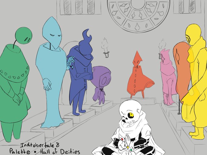 Inktobertale 8: Palette and Hall of Deities I took this chance to work on my character designs, and, while not very “deity-like,” this is usually where my head goes lol #undertale #inktale #inktober #inksans #sans #inktalesans