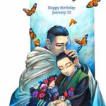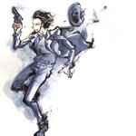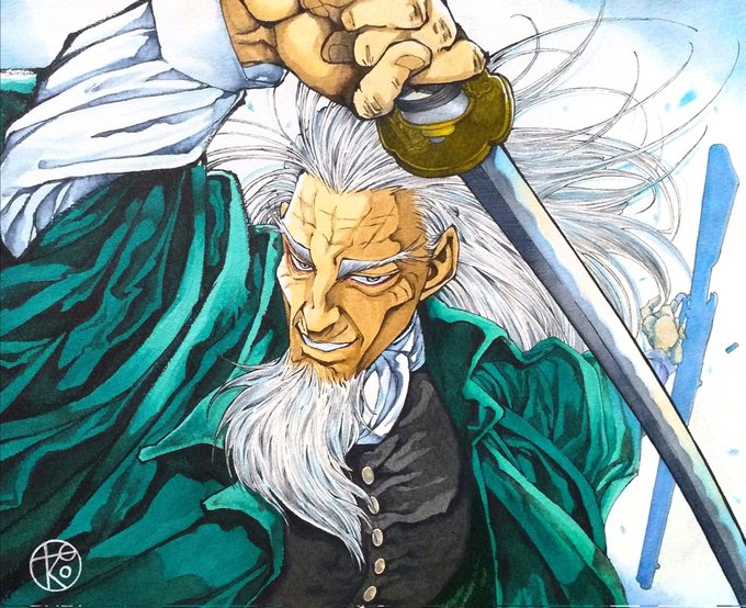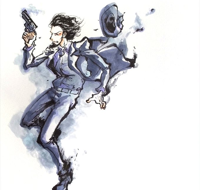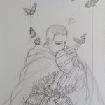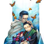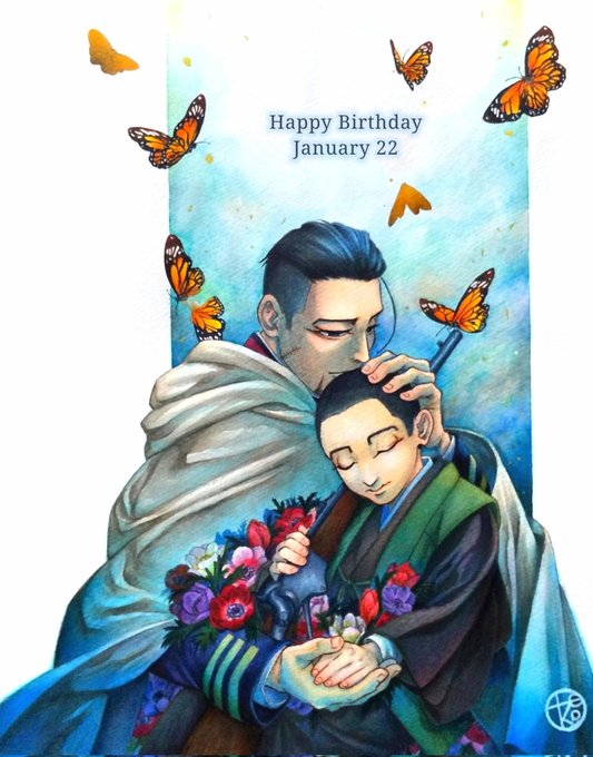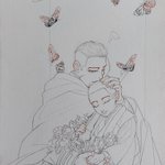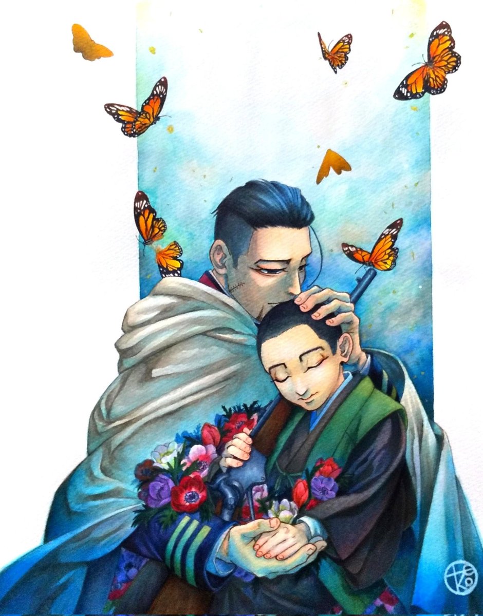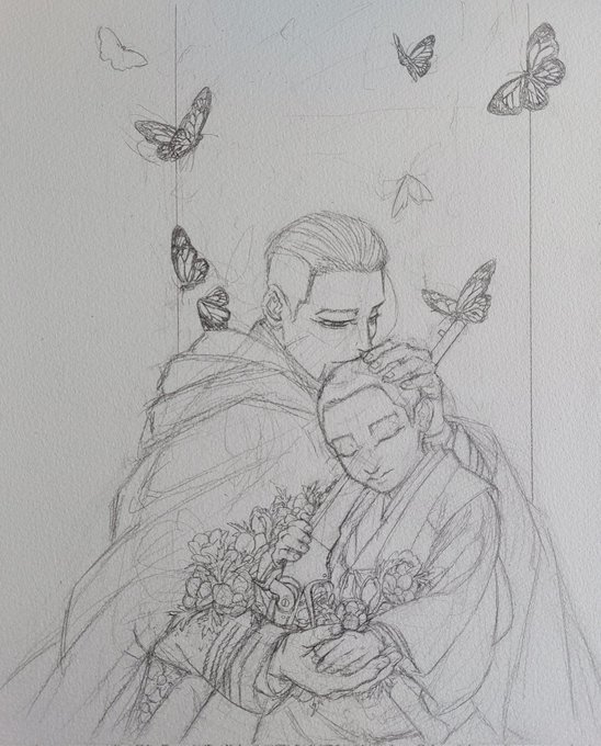 誕生日絵の下書きと線画と完成絵 これがな、こうして、こうなるんじゃよ... 使用画材はいつもと同じくコピック、アルコールマーカー、水彩ペンそしてペンてる筆金の穂 蝶と銃描くの頑張りました #金カムアナログイラスト部