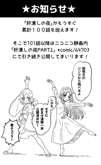 【お知らせ】 #肝潰しの夜 ついに累計100話達成! 次回からはPART2での更新となります! お気に入り登録よろしくね! ▼肝潰しの夜 PART2 seiga.nicovideo.jp/comic/64703 #ニコニコ漫画