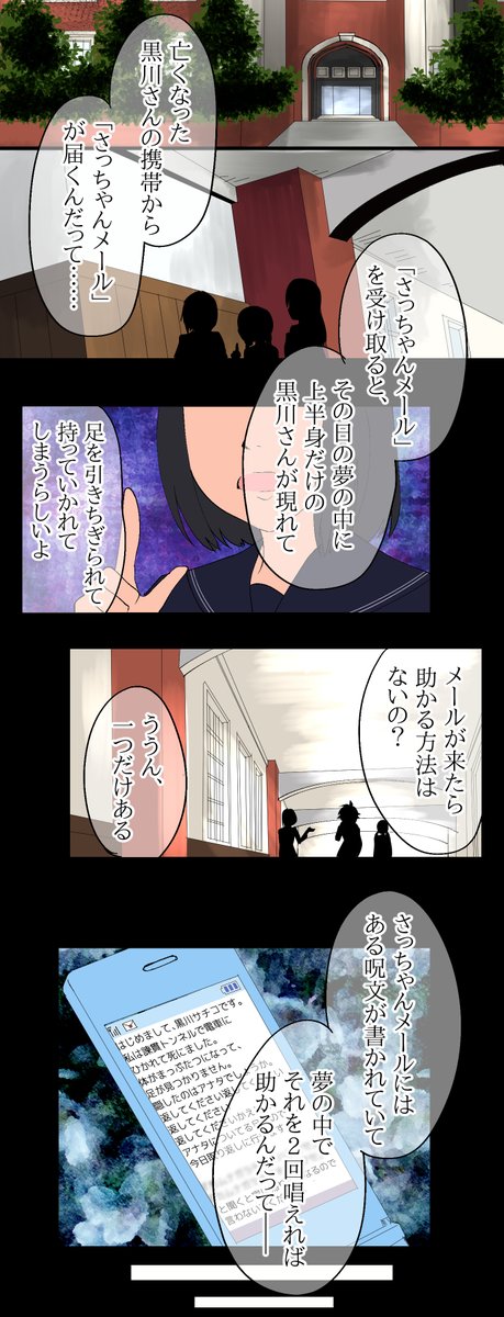 #肝潰しの夜 -裏- 「さっちゃんメール」をFANBOXで公開中! 登場する怪異はあのさっちゃん…なのにめっちゃ怖い?本作屈指のガチホラー回をぜひお楽しみください。 #ホラー漫画 temimin.fanbox.cc/posts/5985922