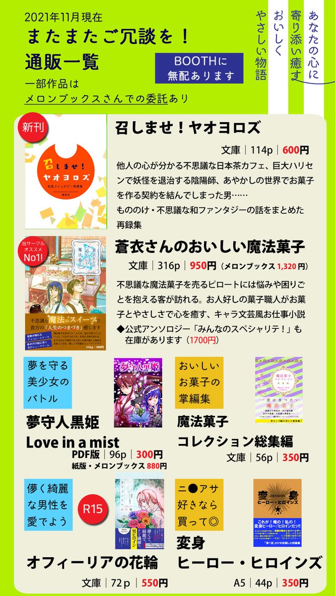 #エアコミティア139 創作小説サークルです! ◆不思議な魔法のお菓子でお悩みを癒やす現代FT ◆お茶とお菓子、ほのかな恋愛のあやかしもの掌編集 ◆ヒロイン属性男子を救う掌編集 通販 ※アドレスは一次創作のみのリスト(BOOTHでは二次も扱っています)→ mata2bken.booth.pm/item_lists/mgK…