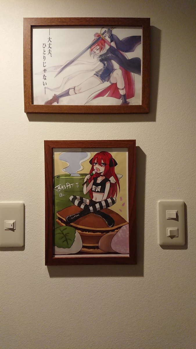 推しに描いていただいた推しの絵を壁に貼りました!!!! (今回お願いしたのは下段) いいですなぁいいですなぁ。 ニヤニヤしてる顔写り込んでないなヨシ。 これ見てお仕事頑張ります!!!! #aiしてるkaらよ #くるみちゃんまじ天使