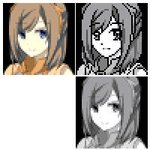 前作の顔グラのドット絵と原画(イラスト・持平勇賢さん) それと編集中の画像です。 こうして並べてみると、あんまり似てない😅 編集中はドットを打つことに集中したいので、モノクロにしてます。 #RPGツクールMV #ドット絵 #メイキング