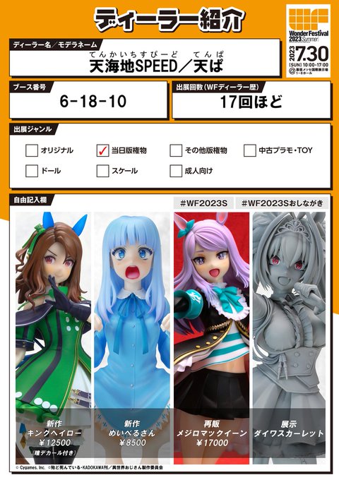 WF2023夏告知【天海地SPEED 6-18-10】 新作 キングヘイロー 12500円 瞳デカール付き めいべるさん 8500円 再販 メジロマックイーン 17000円 展示 ダイワスカーレット すべて自家製キットです。一部は3D出力品です。 #WF2023S #ワンフェス2023夏 #ワンフェス夏