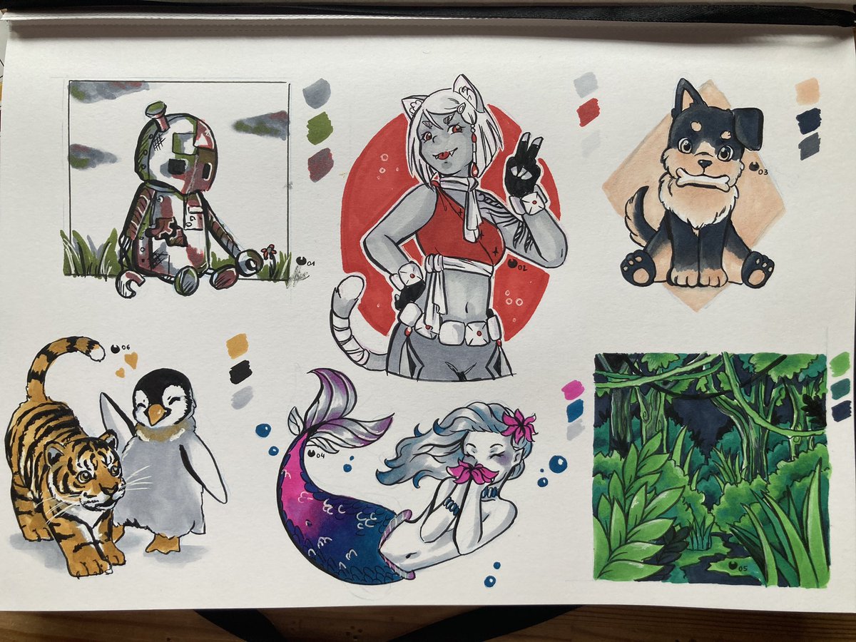 Ich mache meine ganz eigene #Inktober#drawtober2021 Challenge, indem ich mir zwei zufällige Farben generiere und mit denen und einem weiteren Farbton ein Bild zu malen. Hier habt ihr die ersten 6 Bilder °^°