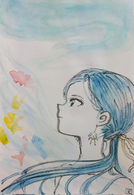 今日は創作キャラでも名前もまだない、性別不詳のキャラがらくがきしてる絵流します。 使ってるのはきっとマイ筆・・・ #らくがき #イラスト #一次創作 #春の創作クラスタフォロー祭り #絵描きさんと繋がりたい #天星画 #水彩画